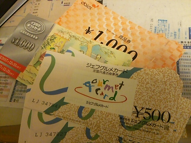 あと、「チケットキング」でジェフグルメカード500円分が476円で売ってたので6枚、ぐるなびギフトカード1000円分が935円で売ってたので2枚、それぞれ買いました。