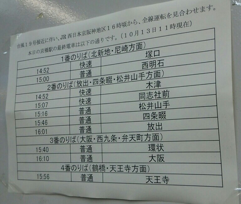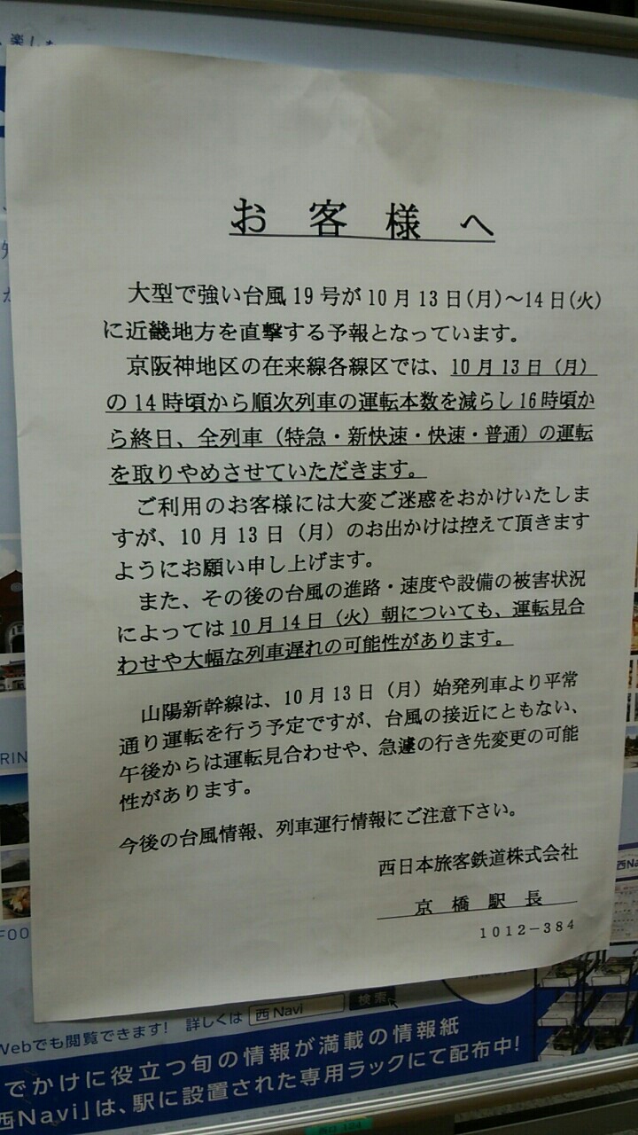 10月13日夕方、近畿地方に台風19号がやってきました。