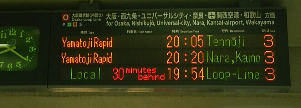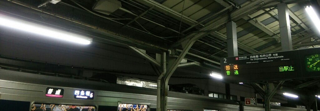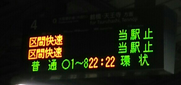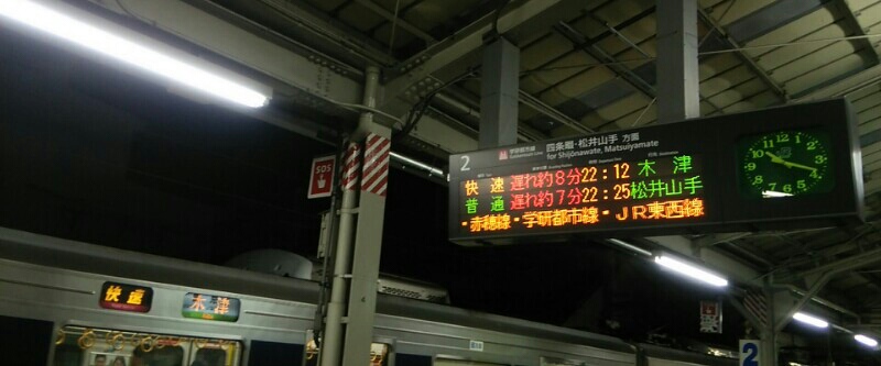 | 22:12 快速 木津 22:25 普通 松井山手 22:32 快速 奈良 22:48 普通 四條畷 22:54 区間快速 木津 23:05 普通 四條畷 23:12 区間快速 京田辺 23:25 普通 四條畷 23:32 区間快速 京田辺 23:46 普通 松井山手 23:59 普通 四條畷 | 22:23 快速(普通) 木津 22:30 普通 松井山手 23:00 区間快速(普通) 木津 23:07 普通 四條畷 23:25 普通 四條畷(推定) 23:46 普通 松井山手(推定) 23:59 普通 四條畷(推定) |