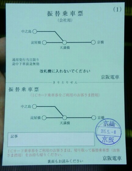 — イスムさん@無課金パズドラー (@Yakimeshi113_P) 2015, 5月 9渋滞してます。振替輸送で調子のって京阪で遊んでたら淀屋橋着いた時点で振替輸送終わってて切符買ったなう pic.twitter.com/dz3x0WerXK